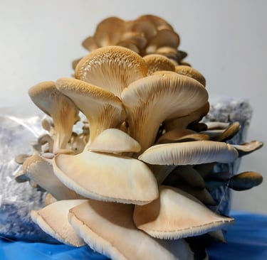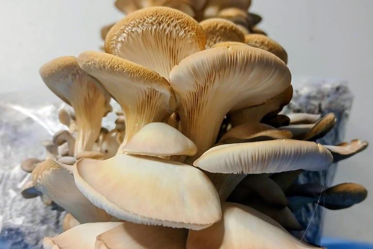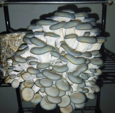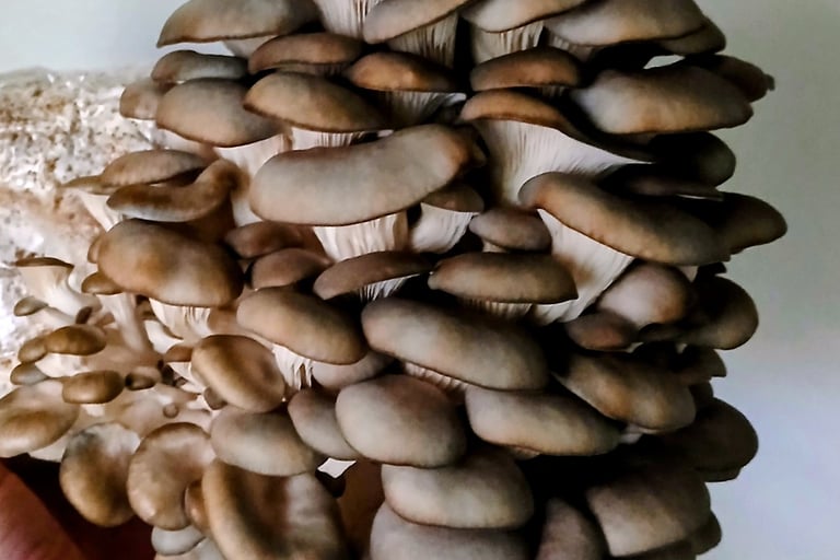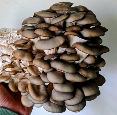 Harvest oysters when the caps are formed but the edges are still slightly curled down. If you wait too long, caps flatten out wide and spore drop gets heavy.